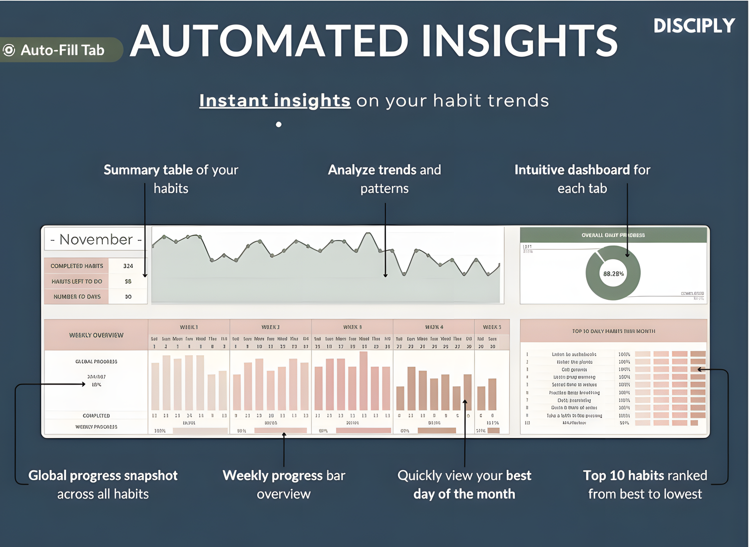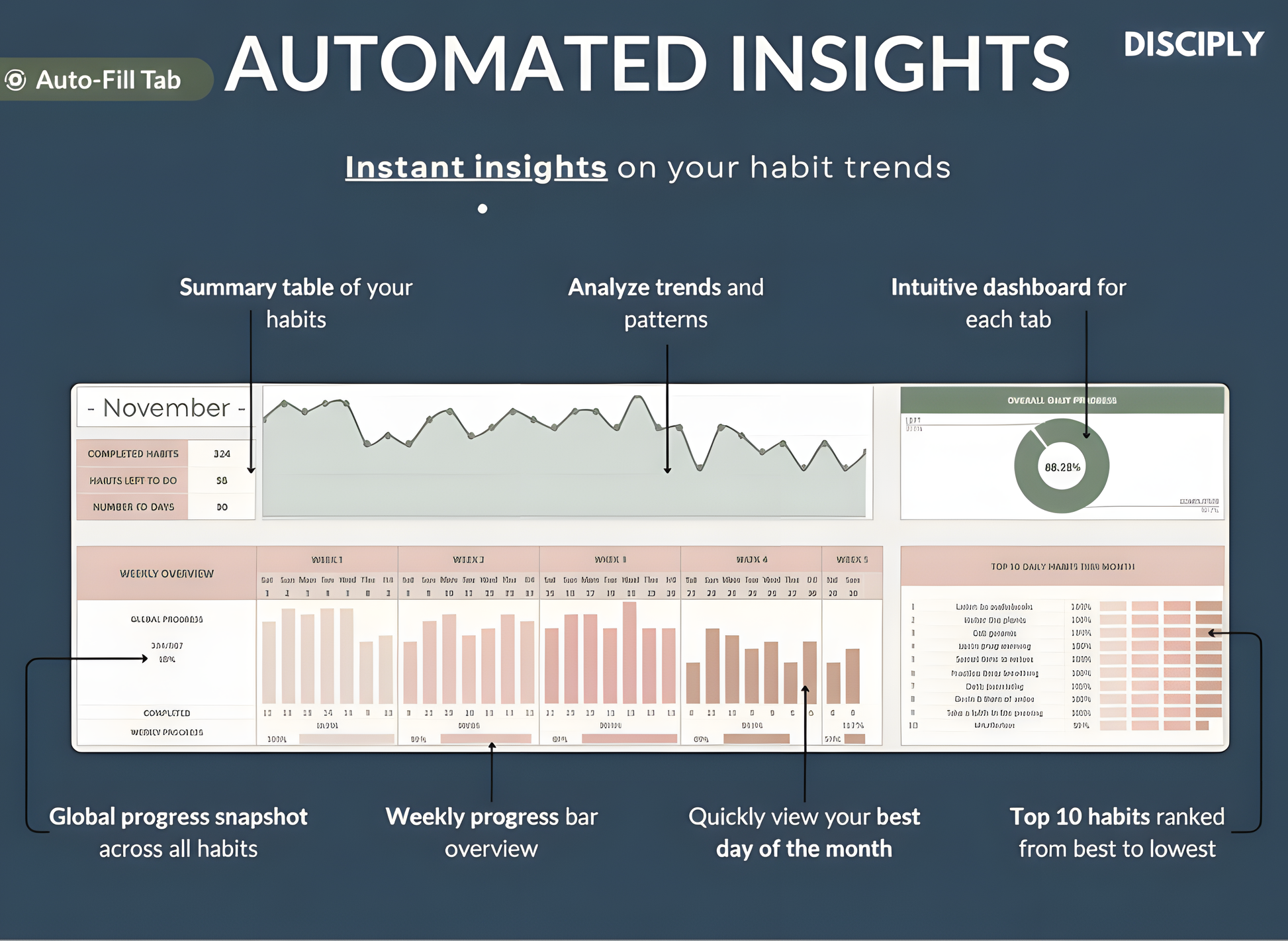 He probado muchísimas aplicaciones para crear hábitos, pero ninguna me ha ayudado a ser tan responsable como esta hoja de cálculo. La lista de verificación y los gráficos circulares integrados hacen que sea realmente divertido ver mi progreso. De hecho, me entusiasma actualizarla a diario.
